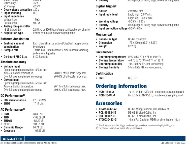 - The PCIE-1841/L features 16/8 simultaneously sampled input channels (1MS/s) with 16-bit resolution and 22.5 kHz or 250 kHz bandwidth.