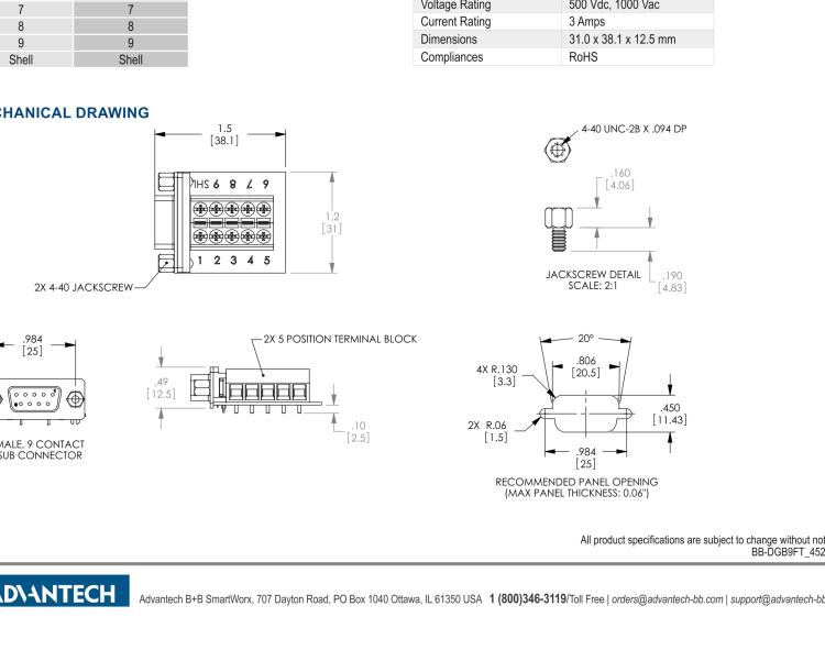 - BB-DGB9FT is a convenient way to perform field termination of DB9 cables. Separate connection points are provided for all 9 positions of the connector plus GND. Terminal block design with set screws provides reliable electrical connections. Terminal block area is marked for fool-proof termination.