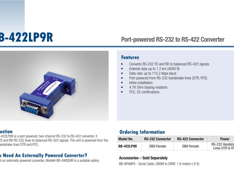 - 该产品是一个端口供电的双通道RS-232到RS-422转换器。它将TD和RD RS-232线路转换为平衡差分的RS-422信号。该装置由RS-232握手线路DTR和RTS供电。为了给设备供电,这些握手线中的一条必须被断言(高电平)。
